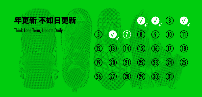 |用網點效果的安全鞋模擬印刷的日曆代表鞋子使用的足跡,打勾是維護清潔鞋子的紀錄,如文章所述,