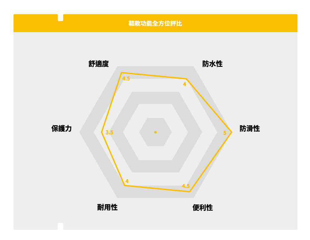 鞋身採用Bootie防水技術,可有效隔絕水分進入鞋內空間,同時保持透氣性註:如需長時間於水中工作,建議挑選 安全雨鞋