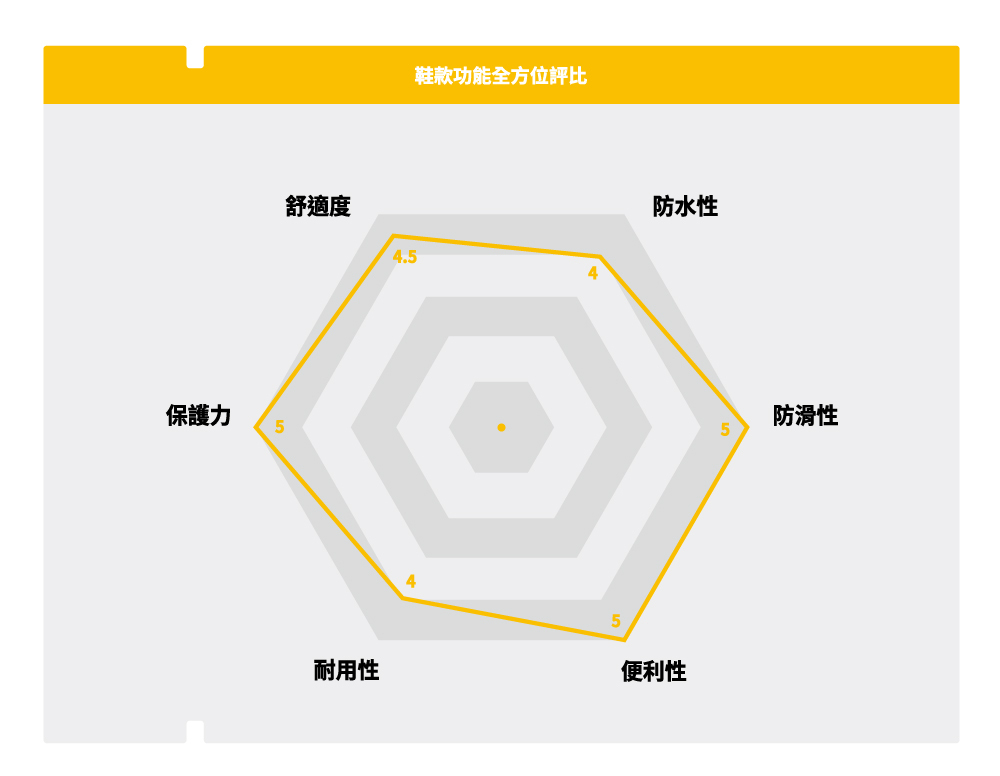 鞋身採用Bootie防水技術,可有效隔絕水分進入鞋內空間,同時保持透氣性註:如需長時間於水中工作,建議挑選 安全雨鞋