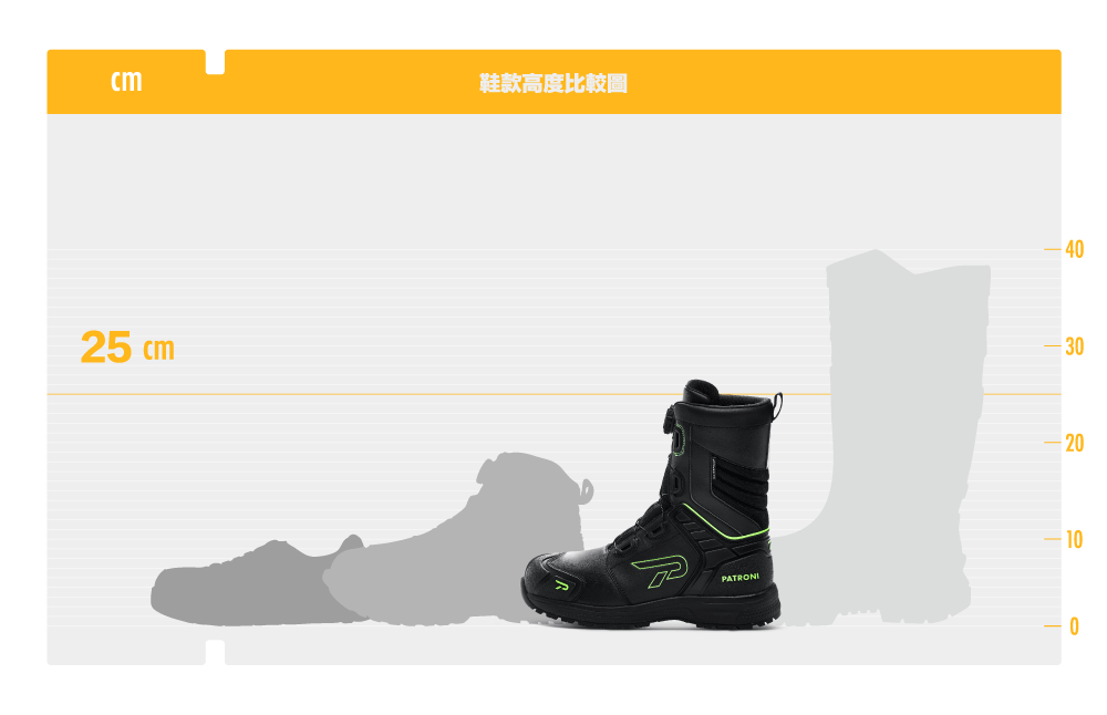 超纖鞋面∣橡膠大底∣筒高 25cm ∣ 重量 800g (EUR43) ∣ 寬楦 2E|鞋碼 EUR 36-48防水技術