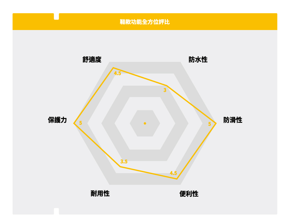 雙層密度橡膠大底,有效避免水解狀況。底紋設計能減少泥土或其它雜物積存,易於清潔,並具備易彎曲、耐磨、防扭功能設計防水功能